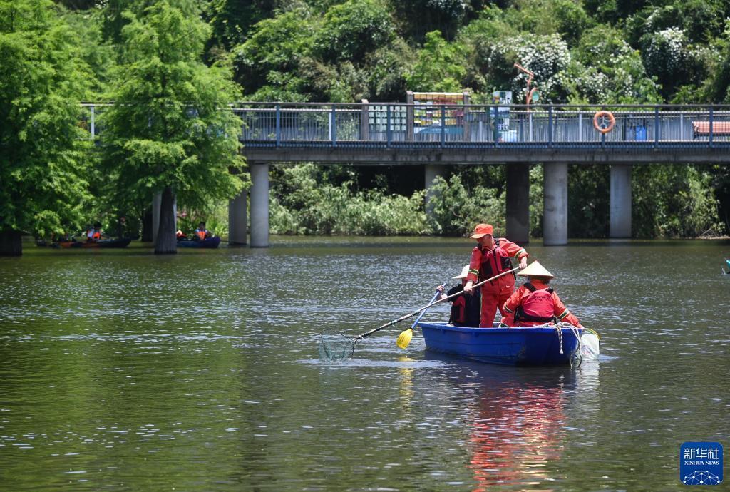 5月15日,工作人員在杭州市臨安區(qū)青山湖國(guó)家森林公園清潔水上漂浮物。