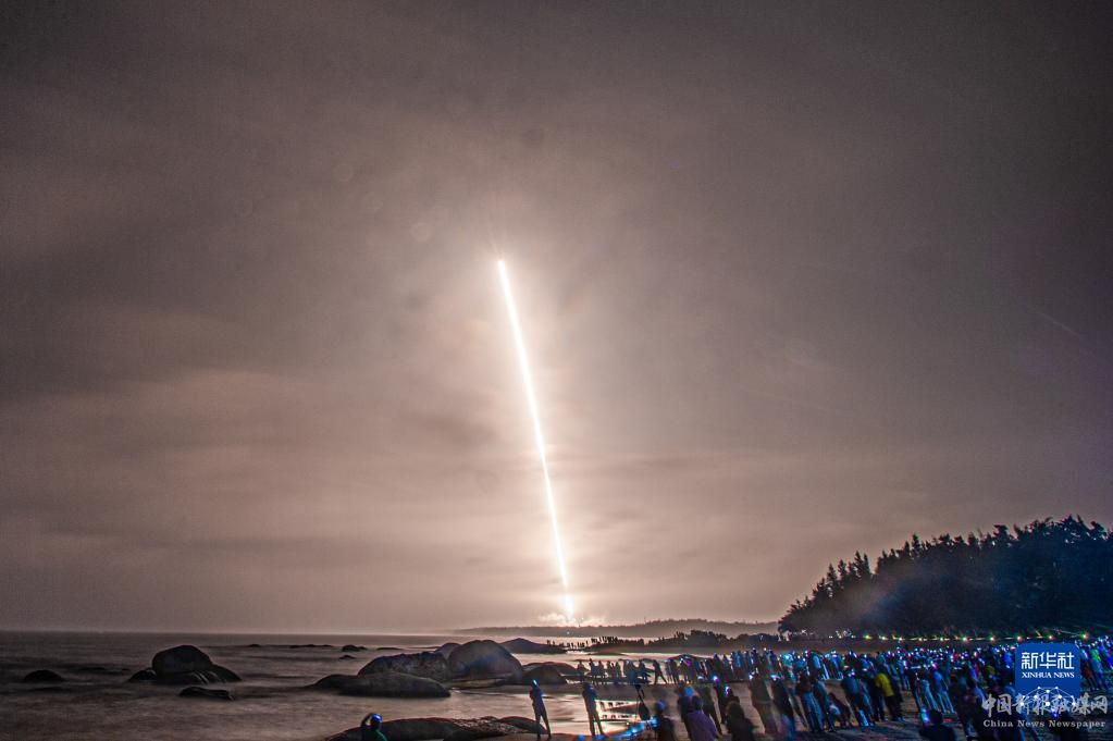 大批觀眾在海南省文昌市淇水灣觀看、拍攝火箭發(fā)射(2021年3月12日攝)。