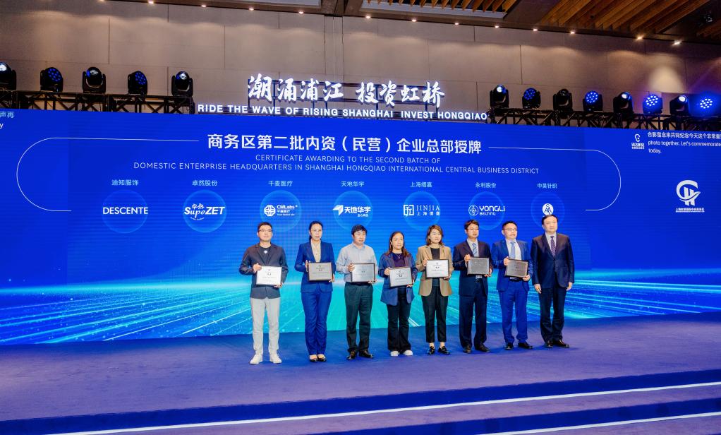 5月25日,“潮涌浦江·投資虹橋”2023虹橋國(guó)際中央商務(wù)區(qū)投資促進(jìn)大會(huì)現(xiàn)場(chǎng),7家新認(rèn)定的內(nèi)資(民營(yíng))企業(yè)總部集體授牌。新華社記者周蕊 攝