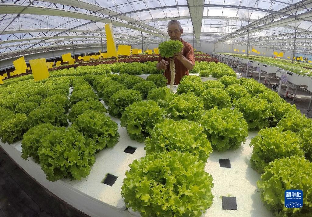 6月1日,在石家莊藁城區(qū)河北炫夢農(nóng)業(yè)科技有限公司霧培生菜聯(lián)棟溫室大棚,工作人員在收獲生菜。
