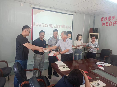 在2023年6月份“支部主題黨日”活動中,沙洋縣委宣傳部為8名黨員集體過“政治生日”,為他們發(fā)放“政治生日”賀卡。8名黨員分享交流入黨經(jīng)歷,回顧自己的成長歷程和入黨以來的追求與表現(xiàn),查找自身差距,進行自我剖析,進一步增進黨員對黨的感情,激發(fā)黨員干事創(chuàng)業(yè)熱情。