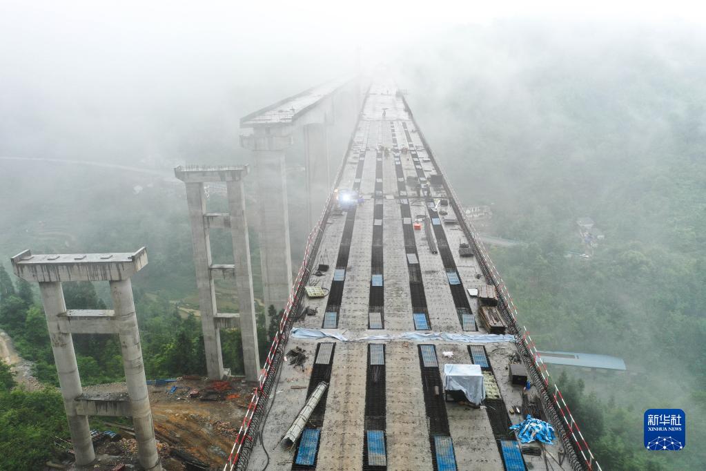 6月15日,貴州橋梁集團工人在六安高速3標(biāo)段華竹山大橋上施工(無人機照片)。