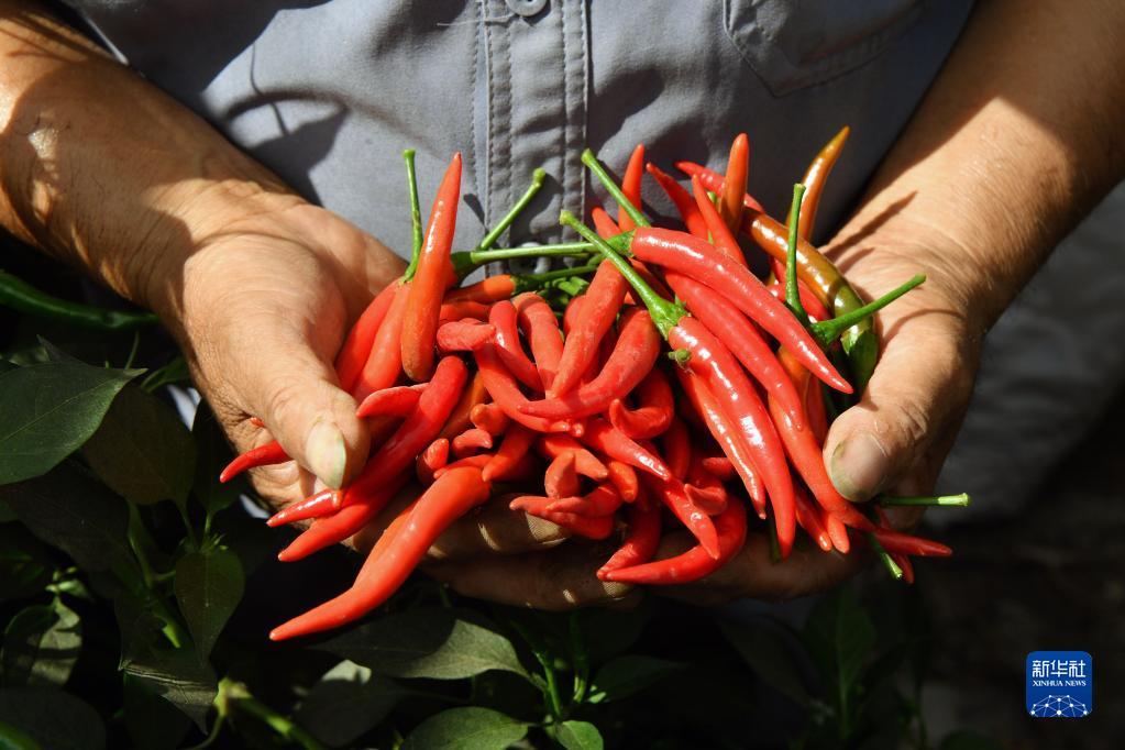 6月26日,村民在河南省安陽市內(nèi)黃縣梁莊鎮(zhèn)馮莊村的大棚里展示剛剛采摘的辣椒。