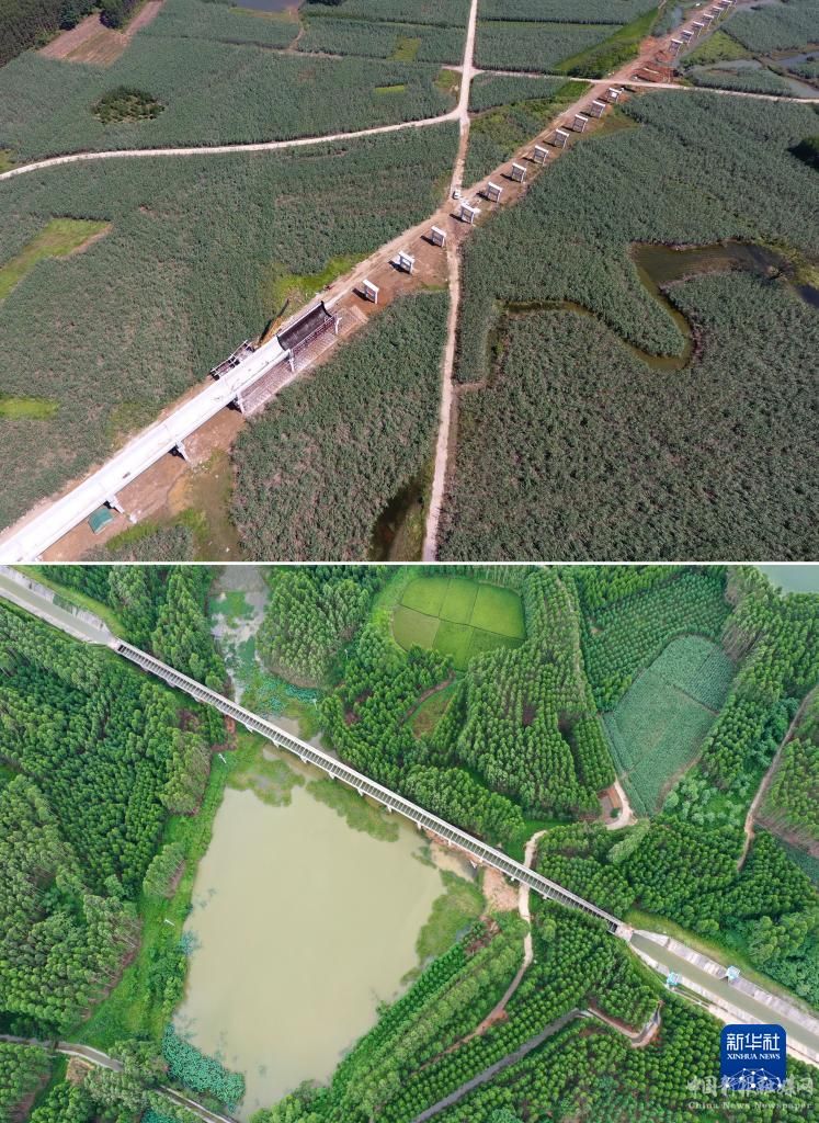 拼版照片:上圖為在廣西來(lái)賓市興賓區(qū)遷江鎮(zhèn)拍攝的正在施工建設(shè)中的“桂中治旱”工程一處引水渡槽(無(wú)人機(jī)照片,2018年9月21日攝);下圖為在廣西來(lái)賓市興賓區(qū)遷江鎮(zhèn)拍攝的已經(jīng)建成通水的“桂中治旱”工程一處引水渡槽(無(wú)人機(jī)照片,2023年7月4日攝)。