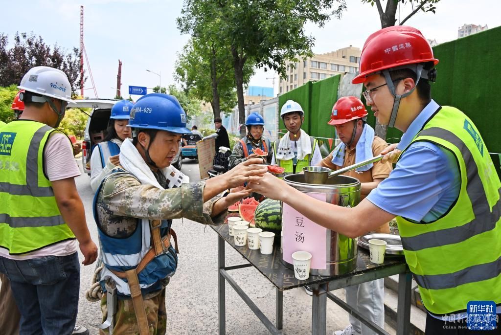 7月10日,中建二局青島濱海國(guó)際中心項(xiàng)目部的工人在休息站領(lǐng)取防暑降溫食品。