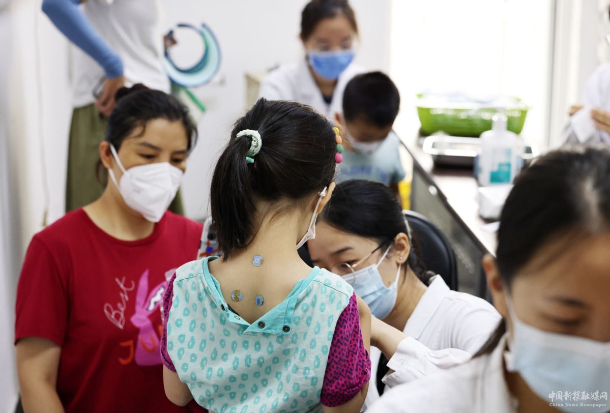 7月11日,在中國(guó)中醫(yī)科學(xué)院廣安門醫(yī)院,兒科醫(yī)生為患兒貼敷。 中國(guó)日?qǐng)?bào)記者 朱興鑫 攝