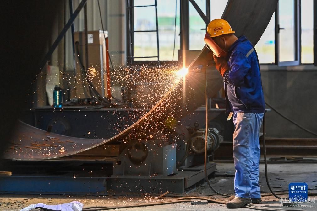 在新疆塔城重點開發(fā)開放試驗區(qū)先行發(fā)展區(qū)中國水利水電第四工程局有限公司塔城分公司,工人在打磨風(fēng)機塔筒(7月22日攝)。