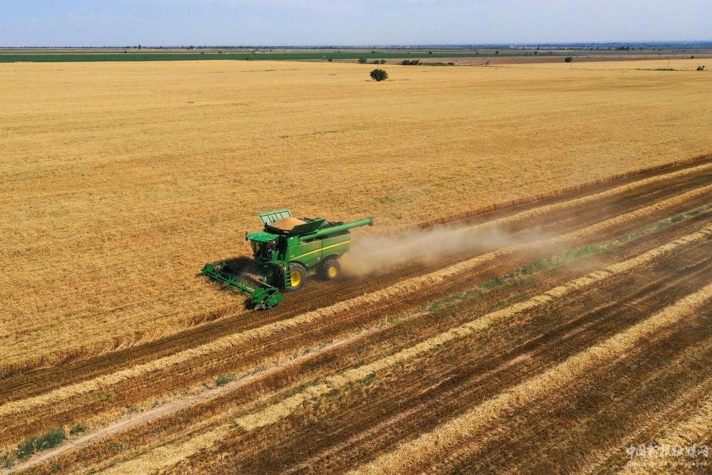 農(nóng)機(jī)手在新疆呼圖壁縣二十里店鎮(zhèn)寧州戶村駕駛聯(lián)合收割機(jī)收割小麥(7月15日攝,無人機(jī)照片)。新華社記者 丁磊 攝