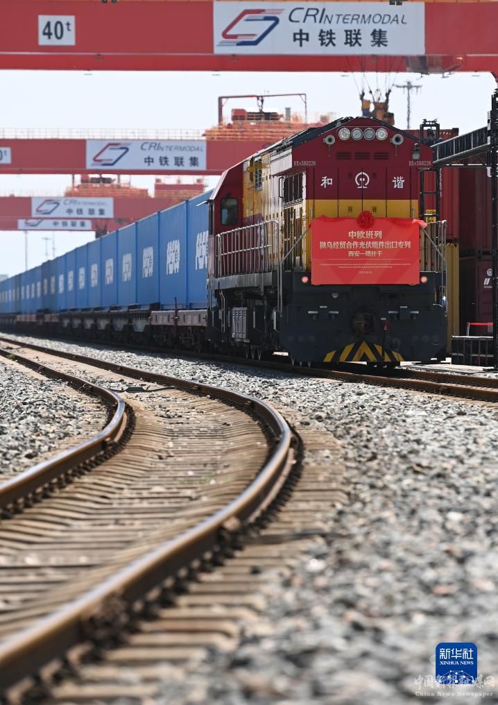 8月3日,中歐班列(西安-塔什干)陜?yōu)踅?jīng)貿合作隆基綠能光伏組件出口專列在西安國際港站準備發(fā)車。