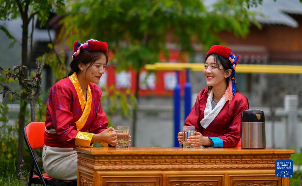 錯(cuò)那市貢日門巴民族鄉(xiāng)斯木村第一書記尼瑪卓瑪(右一)在與村民一起品嘗莓茶(7月28日攝)。