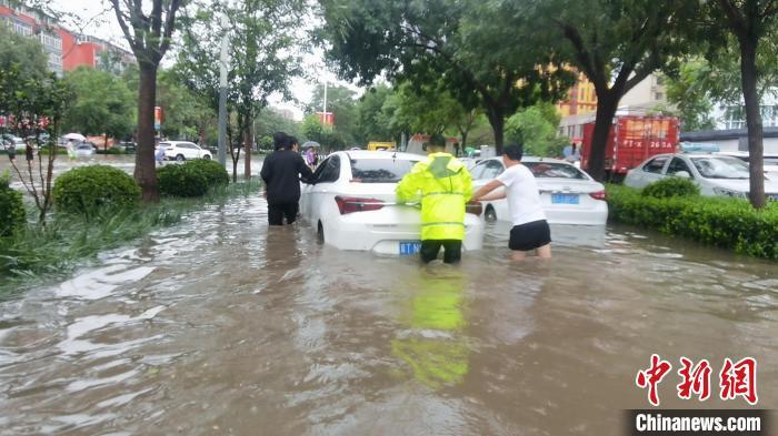 衡水市區(qū)道路出現(xiàn)積水,交警幫助市民推車(chē)。  王鐵良 攝