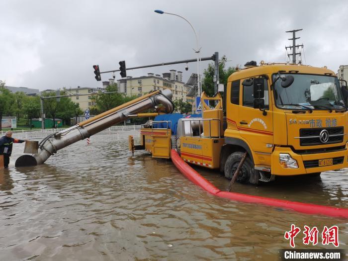 衡水市城市管理綜合行政執(zhí)法局出動(dòng)泵車(chē)抽排積水,加快雨水排瀝。  王鐵良 攝