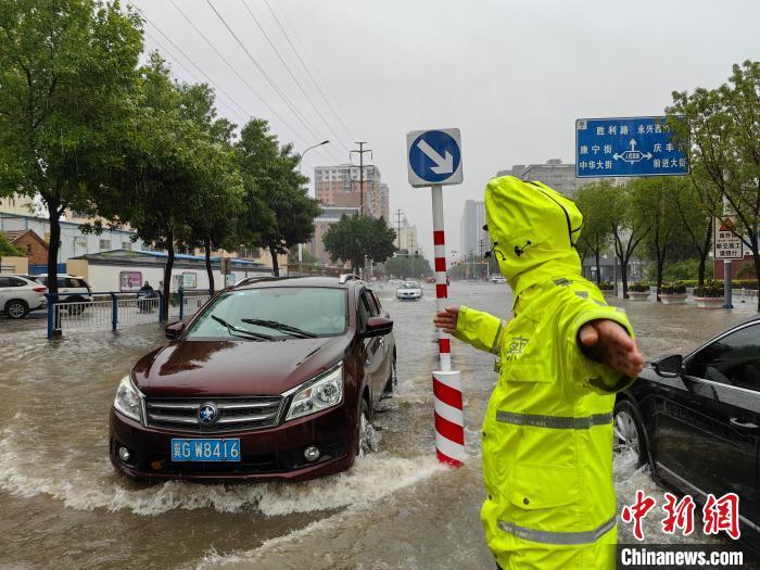 交警冒雨在街頭指揮交通。  王鐵良 攝