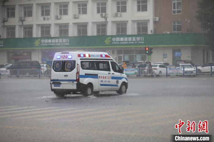 雨中,救護(hù)車(chē)出車(chē)去救護(hù)病人。  王鐵良 攝