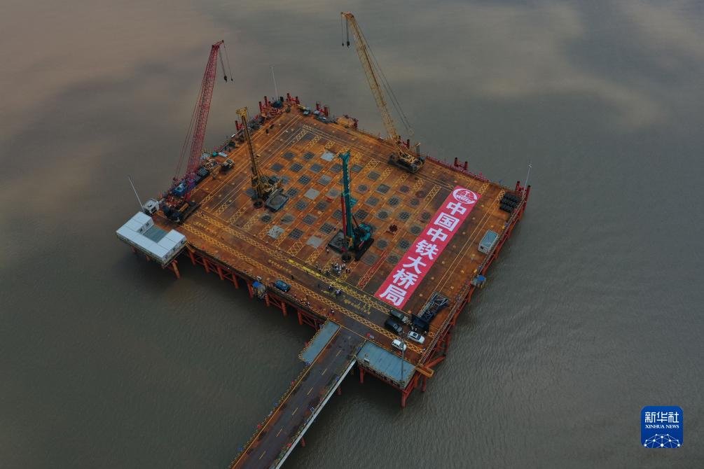 8月10日拍攝的杭州灣跨海鐵路橋北航道橋主塔墩鉆孔樁施工平臺(無人機(jī)照片)。