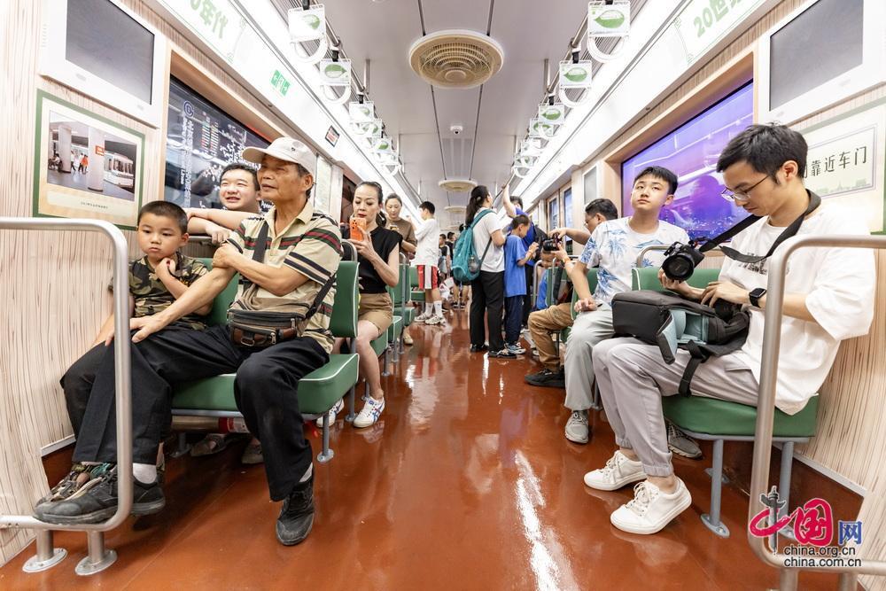 8月8日起,北京地鐵“時光列車”在1號線八通線上線試運營。圖為乘客體驗北京地鐵70年代的DK3型車樣式主題車廂。中國網記者 鄭亮攝
