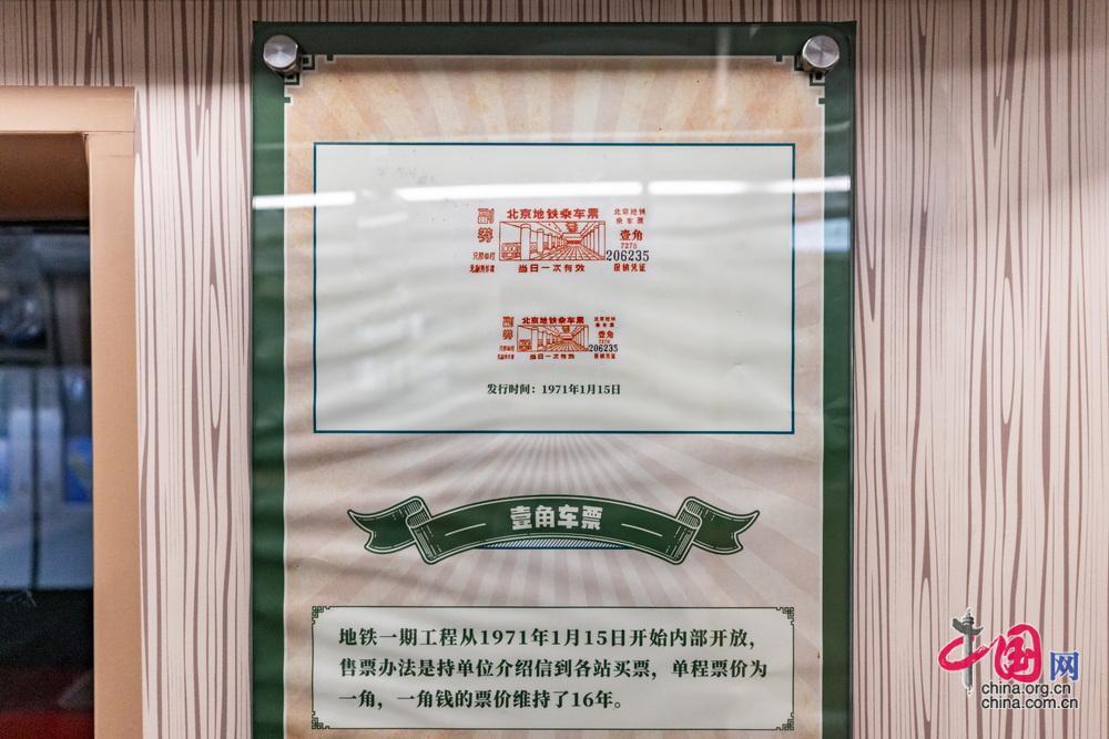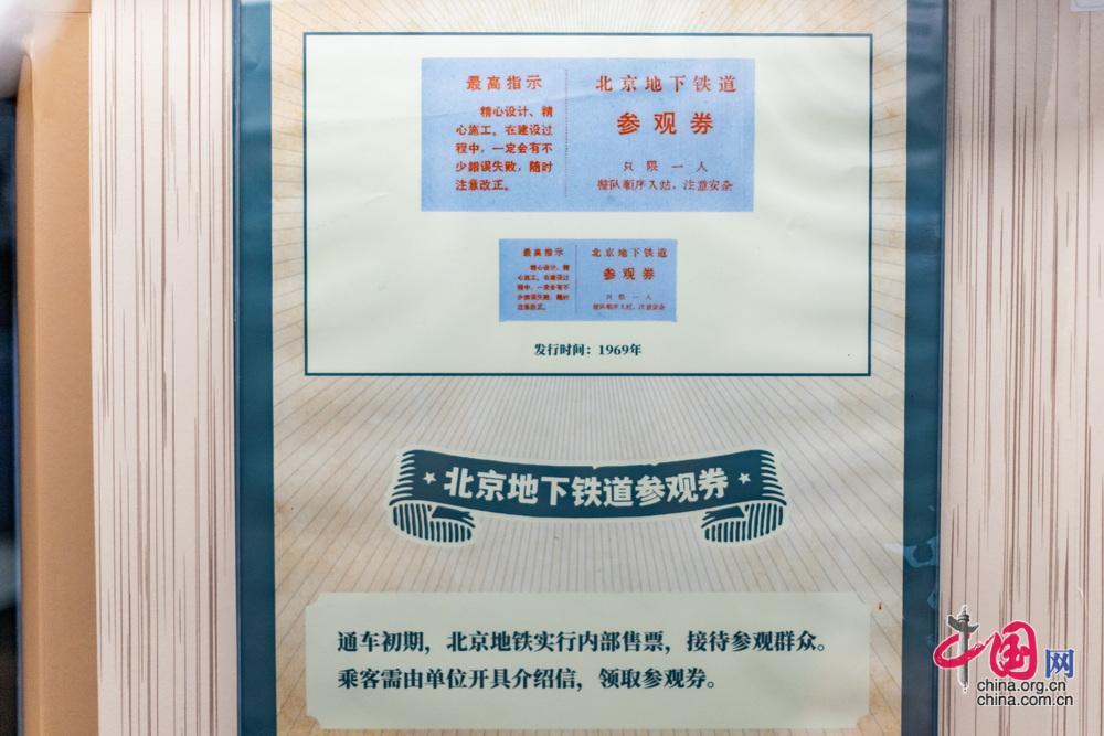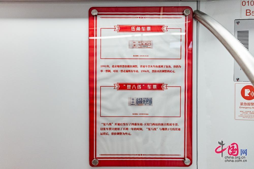 8月8日起,北京地鐵“時光列車”在1號線八通線上線試運營。圖為車廂內展示的在北京地鐵建成初期憑單位介紹信才能領取的參觀卷。中國網記者 鄭亮攝