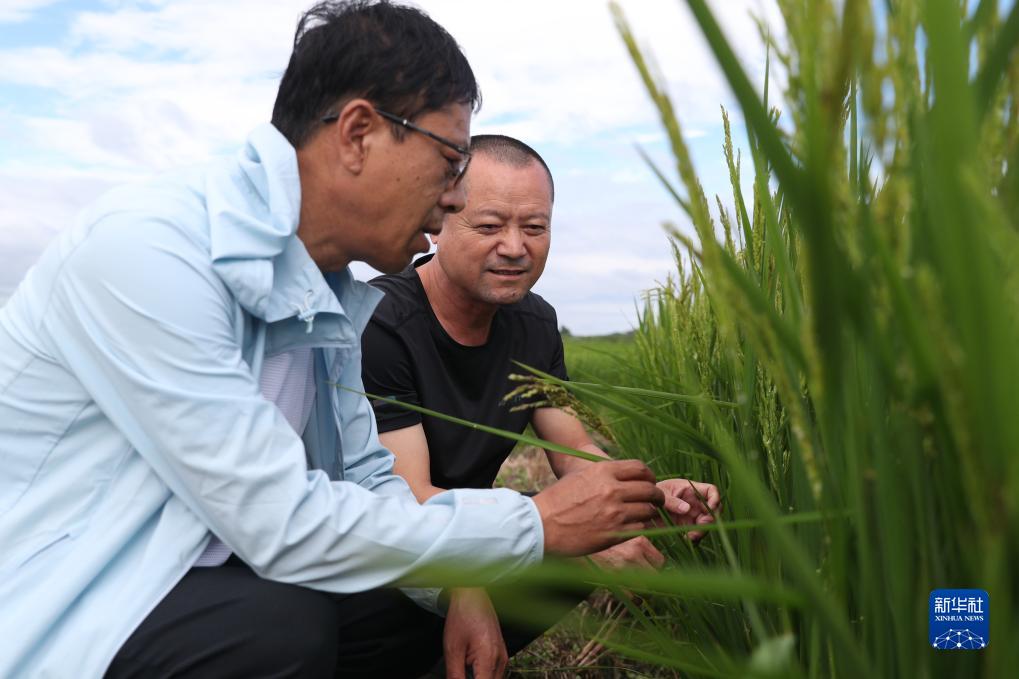 8月11日,黑龍江省尚志市農(nóng)業(yè)技術(shù)推廣中心的工作人員在當(dāng)?shù)匾惶幈缓樗葸^的水稻田里查看水稻情況。