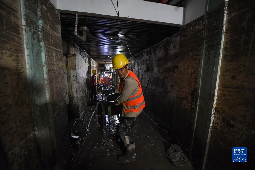 8月12日,在北京市門(mén)頭溝區(qū)醫(yī)院,因水災(zāi)影響無(wú)法從事原本工作的受災(zāi)群眾組成清淤隊(duì)伍,清理醫(yī)院地下室的淤泥和垃圾。