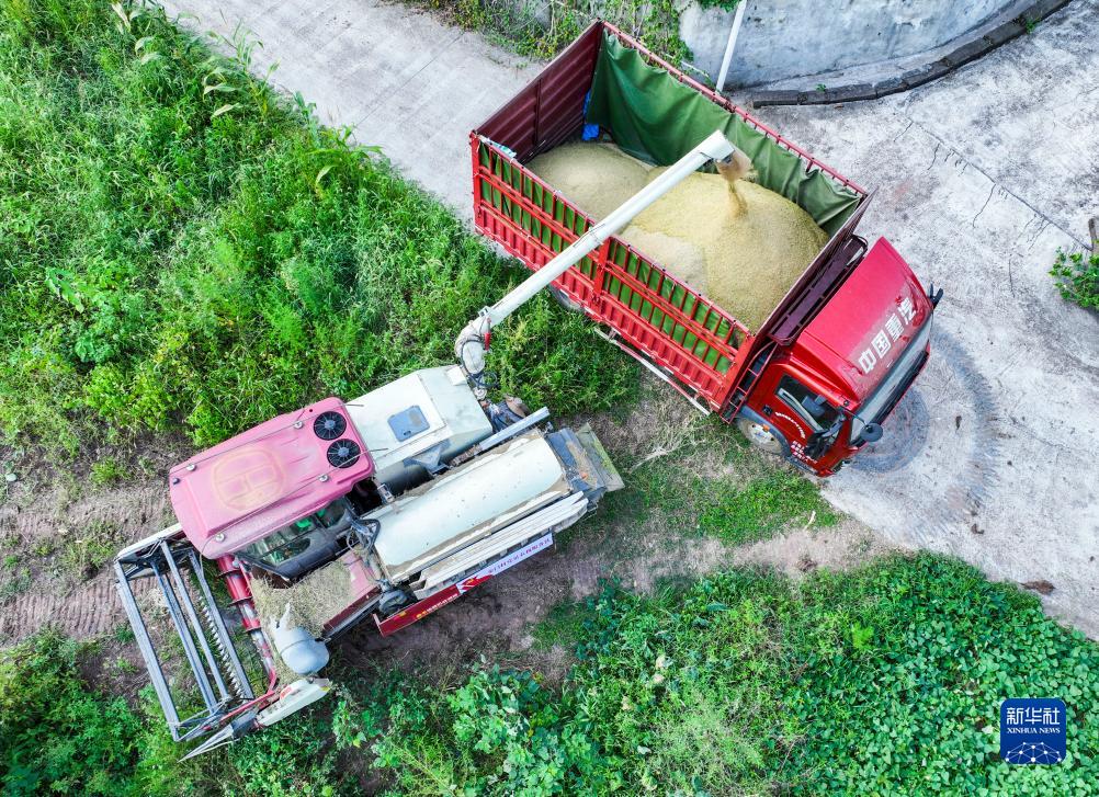8月13日,在永川區(qū)吉安鎮(zhèn)金門村,收割機(jī)將稻谷轉(zhuǎn)運(yùn)至裝谷車內(nèi)(無(wú)人機(jī)照片)。