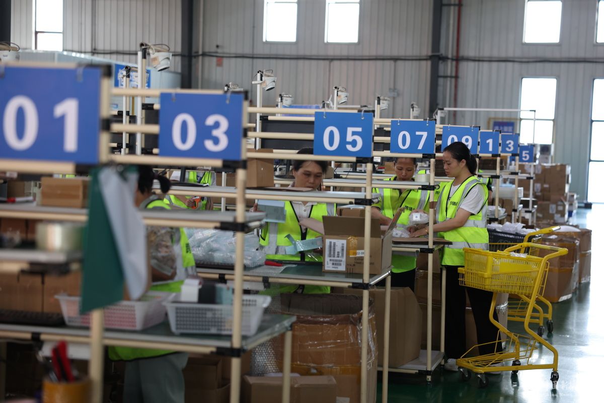 8月16日,江西省龍南市港通跨境倉庫內(nèi),工人打包倉庫里來自全球各地的商品。中國(guó)日?qǐng)?bào)記者 馮永斌 攝