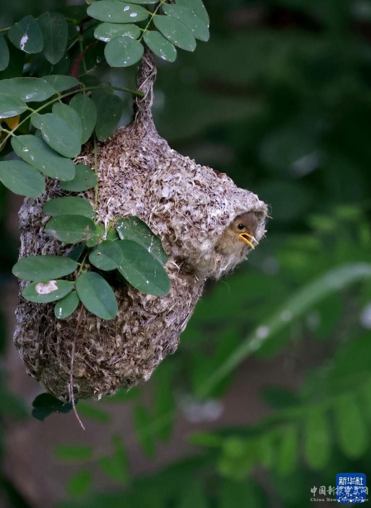 8月19日,一只中華攀雀雛鳥(niǎo)從巢穴中向外張望。