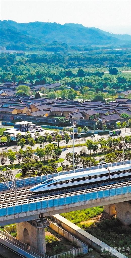高鐵列車從現(xiàn)存占地面積最大的贛南客家圍屋——栗園圍屋旁駛過。2021年底開通的京港高鐵贛深段,極大地縮短了贛南革命老區(qū)同粵港澳大灣區(qū)的時空距離,助力“灣區(qū)+老區(qū)”聯(lián)動發(fā)展。