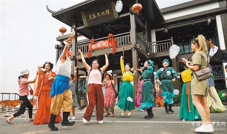 在臨塘鄉(xiāng)虔心小鎮(zhèn)景區(qū),來自珠三角的游客與演員互動。該景區(qū)積極打造粵港澳大灣區(qū)候鳥式“康、養(yǎng)、游、居”休閑旅居度假目的地,游客紛至沓來。