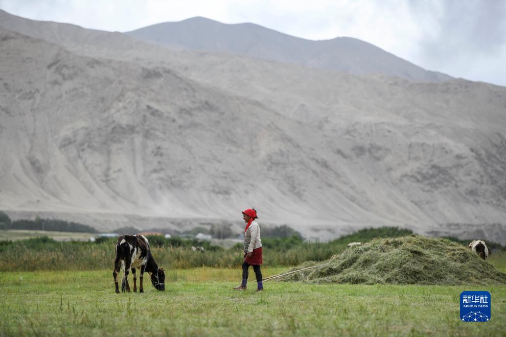 在新疆塔什庫(kù)爾干塔吉克自治縣瓦恰鄉(xiāng),打草的牧民在牧場(chǎng)上放牧(8月28日攝)。