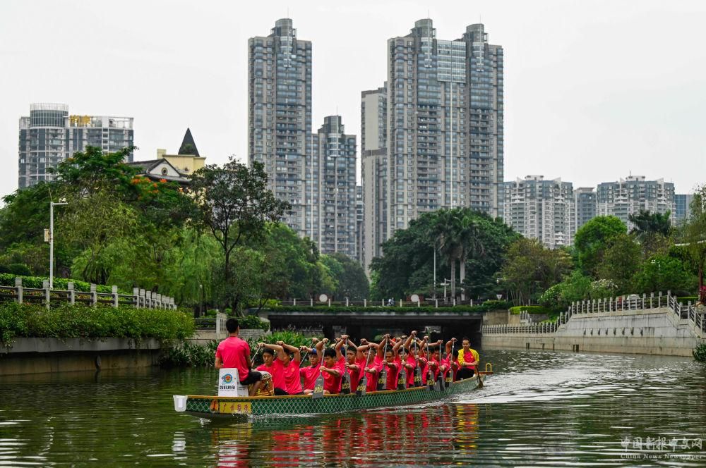 位于廣州CBD的獵德村村民進行龍舟訓練,備戰(zhàn)端午龍舟賽(2023年5月8日攝)。新華社記者 劉大偉 攝