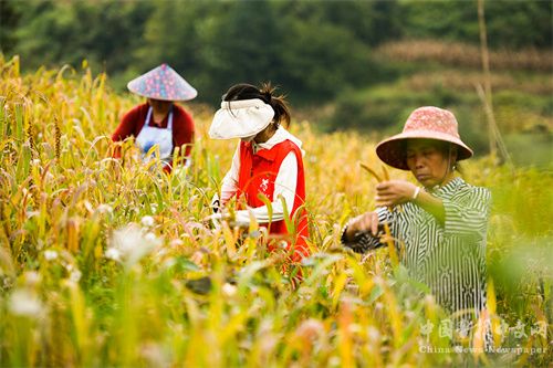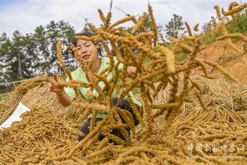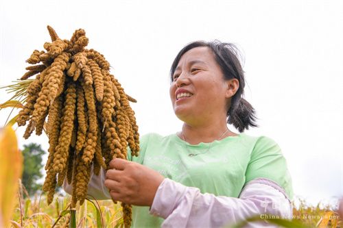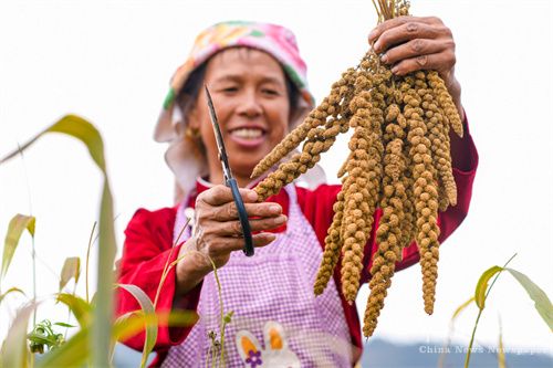 “小米熟了,‘娘家人’來幫忙采摘小米!”