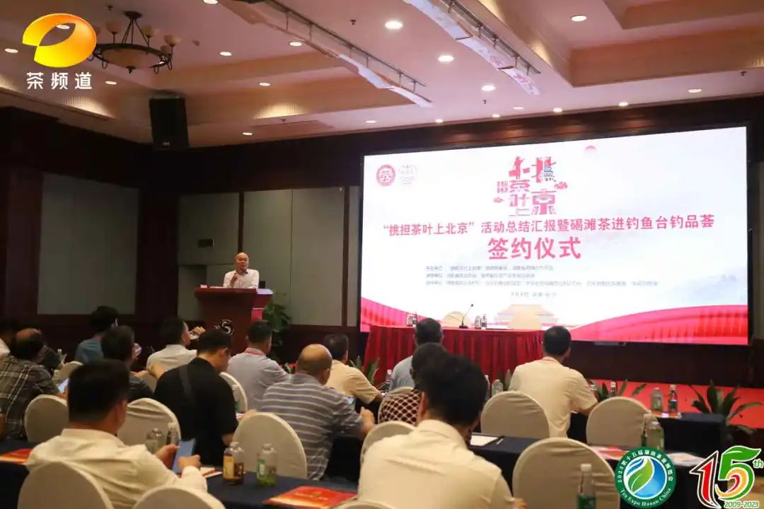 9月9日下午,“挑擔(dān)茶葉上北京”活動總結(jié)匯報會暨碣灘茶進釣魚臺簽約儀式在長沙圣爵菲斯酒店舉行。湖南省農(nóng)業(yè)農(nóng)村廳原副巡視員黃永明、湖南發(fā)展研究中心主任王超、省人大農(nóng)業(yè)委辦公室主任歐陽屹、省農(nóng)業(yè)農(nóng)村廳二級調(diào)研員張陽華、省商務(wù)廳副處長蔡席生、省農(nóng)業(yè)農(nóng)村廳三級調(diào)研員李海燕、省供銷社科教處李江波科長、省茶文化研究會會長肖濤、省紅茶產(chǎn)業(yè)發(fā)展促進會會長伍崇岳以及張家界永定區(qū)副區(qū)長康彥凱、保靖縣副縣長劉文武、湘潭市茶葉辦主任牛峰、張家界莓茶中心主任鄧武成、桑植縣農(nóng)業(yè)農(nóng)村局茶葉辦主任瞿新華、保靖縣茶葉辦主任楊慶、常寧市茶葉辦主任李春林、沅陵縣茶葉辦副主任李晉中、新化縣茶業(yè)協(xié)會會長歐陽輝、石門縣茶業(yè)協(xié)會會長覃小紅等省直相關(guān)部門負責(zé)人,茶界專家及“挑擔(dān)茶葉上北京”活動承辦單位,活動冠名品牌和支持品牌負責(zé)人及相關(guān)品牌企業(yè)代表,北京釣魚臺釣品薈、北京新發(fā)地湖南優(yōu)農(nóng)展館等活動落地合作單位相關(guān)負責(zé)人,新聞媒體等100余人參加本次活動。