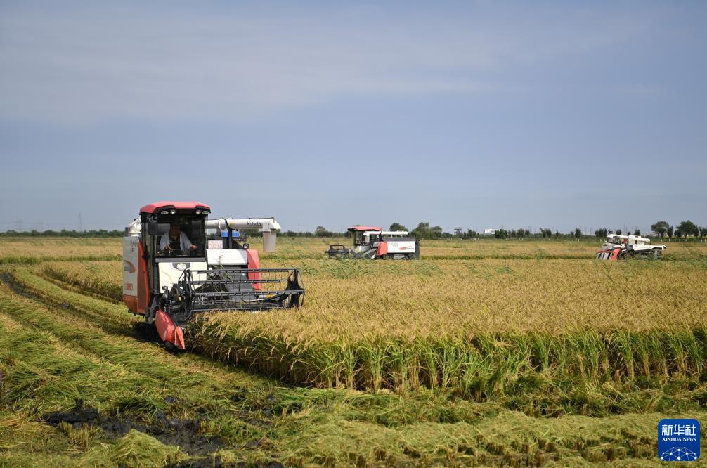 9月12日,收割機(jī)在天津市西青區(qū)王穩(wěn)莊鎮(zhèn)的稻田里作業(yè)。