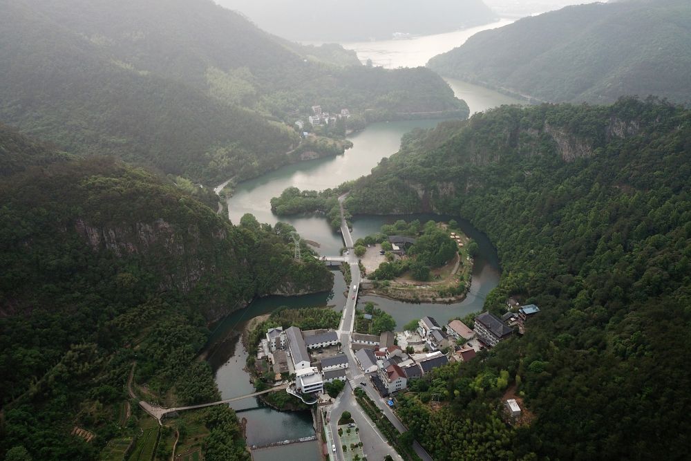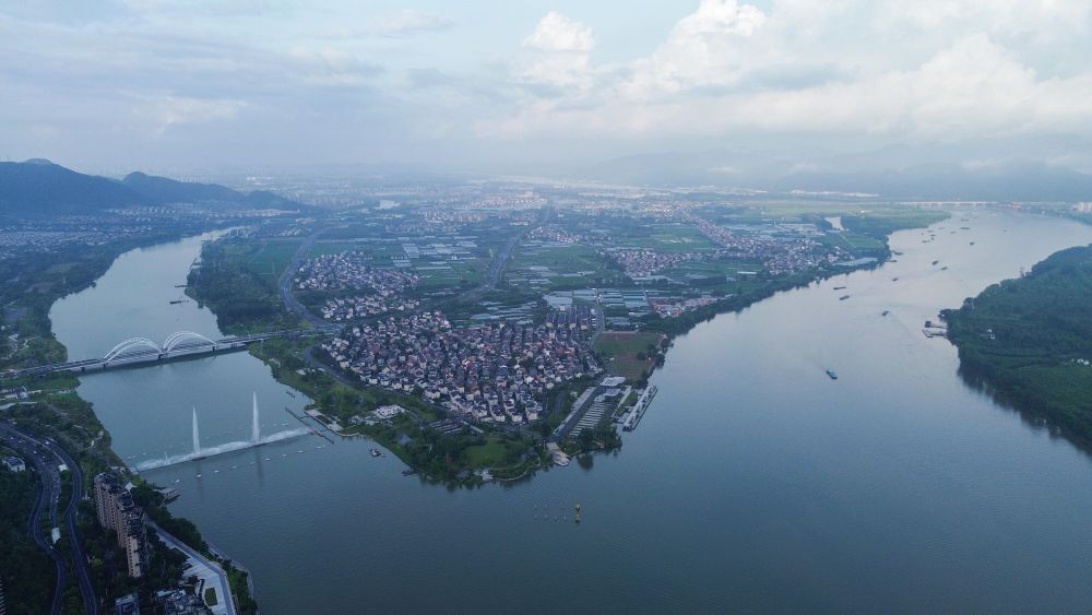 ↑空中俯瞰東洲島。東洲島位于北支江上游與富春江交匯口。