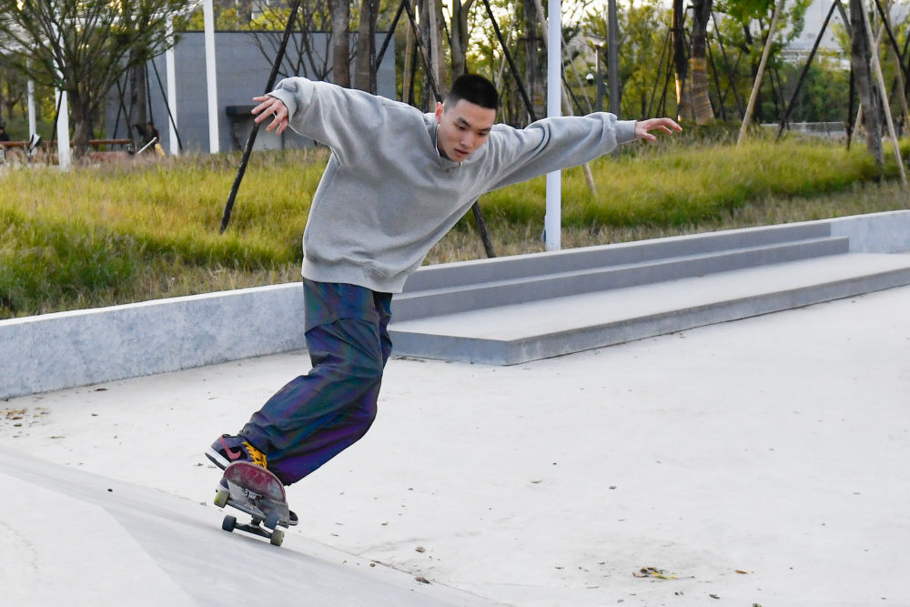 ↑市民在大運河亞運公園里的滑板公園練習(xí)滑板。