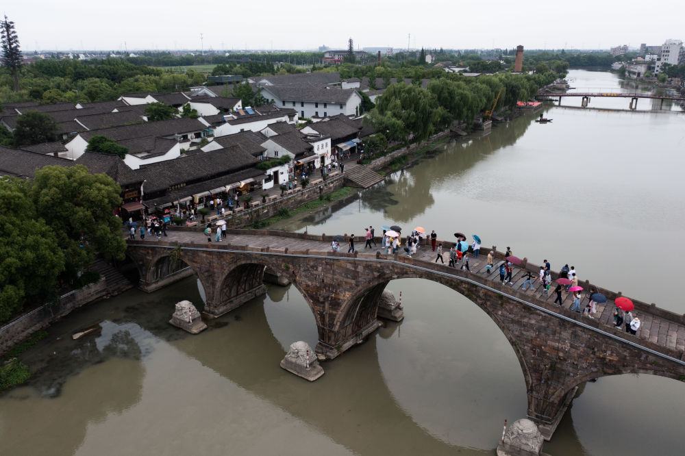 ↑游人在京杭大運河旁的塘棲古鎮(zhèn)游玩。