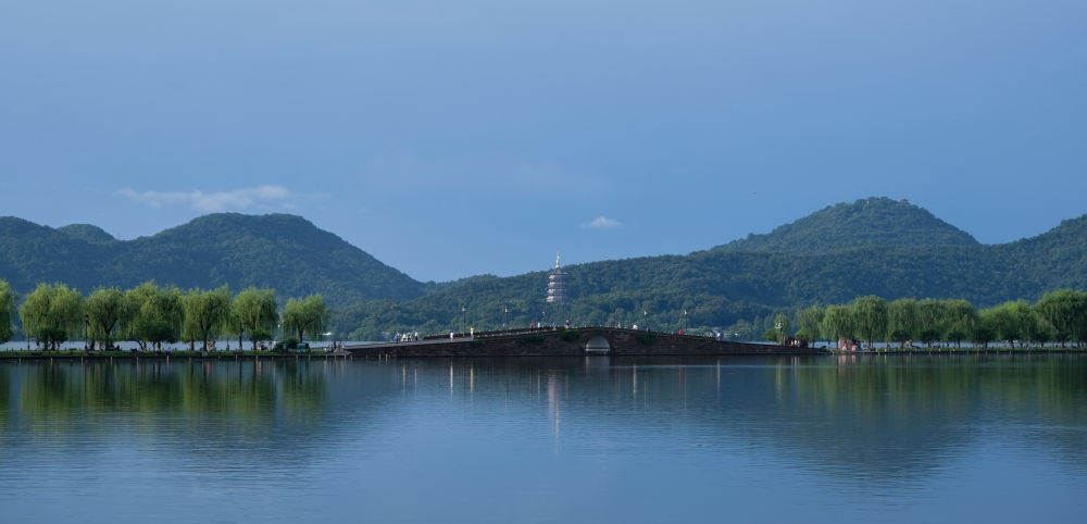 ↑夏日晨曦中的杭州西湖景區(qū)。