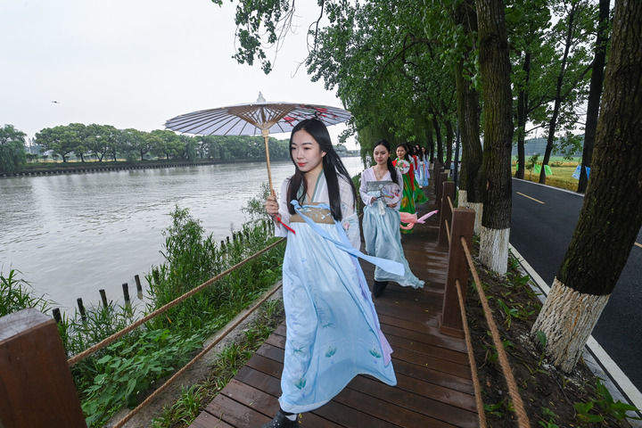 ↑身穿傳統(tǒng)服飾的市民在在京杭大運河杭州臨平段大運河綠道參加全民健身健步走活動。