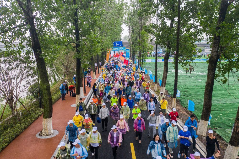 ↑市民在京杭大運河杭州臨平段大運河綠道參加全民健身健步走活動。