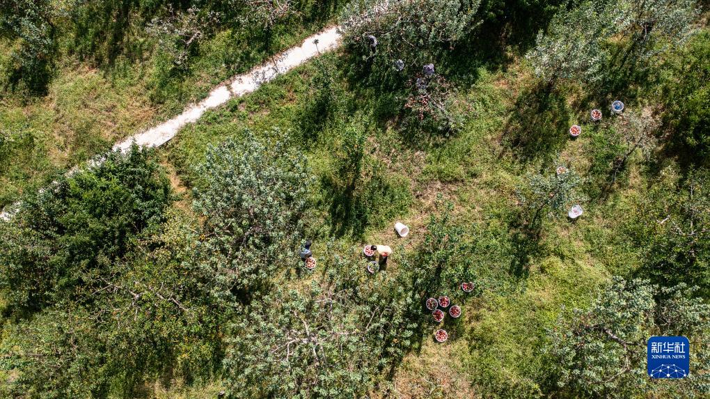 威寧彝族回族苗族自治縣雪山鎮(zhèn)謝家村村民在采收蘋果(9月20日攝,無人機照片)。
