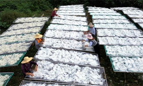 2023年9月28日,安徽省合肥市廬江縣白湖鎮(zhèn)桃沖村馬沖村民組村民馬發(fā)群小作坊的門前一派忙碌,,村民們正在晾曬手工米面。