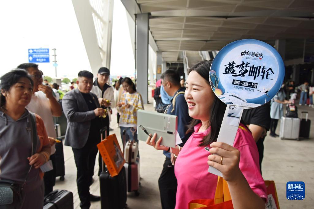 9月29日,游客在青島郵輪母港客運(yùn)中心出發(fā)前合影。