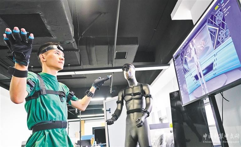 位于湖北青創(chuàng)園(光谷)示范園內(nèi)的武漢灝存科技公司,工作人員借助可穿戴設(shè)備操作虛擬人物。目前,灝存科技的相關(guān)產(chǎn)品已經(jīng)在AR/VR/MR里的醫(yī)療仿真、培訓(xùn)教學(xué)、發(fā)動(dòng)機(jī)維修、影視動(dòng)畫(huà)動(dòng)作捕捉、電子游戲等領(lǐng)域應(yīng)用。