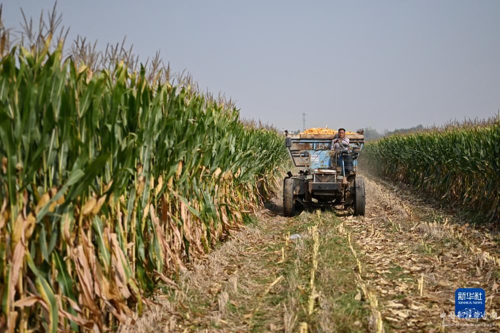 10月8日,農(nóng)民在河北省隆堯縣雙碑鄉(xiāng)雙碑村田地內(nèi)運(yùn)輸剛剛收獲的玉米。