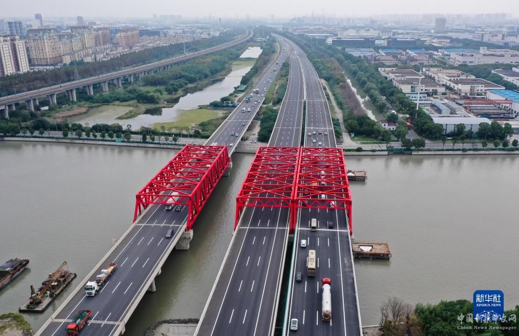10月10日,車輛通過滬寧高速公路青陽港大橋(無人機(jī)照片)。