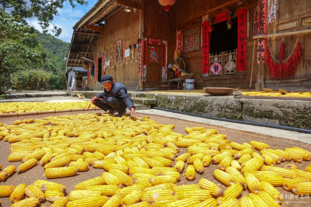 黔東南州施秉縣牛大場鎮(zhèn)石橋村村民在晾曬玉米。(磨桂賓 攝)