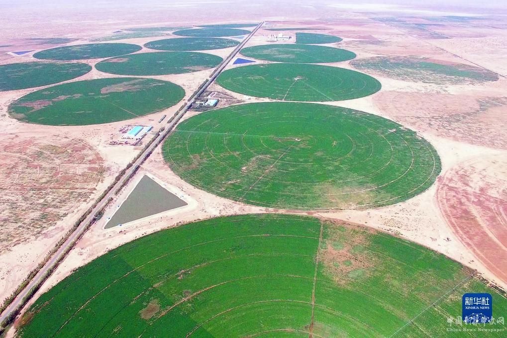 這是8月28日拍攝的內(nèi)蒙古烏蘭布和沙漠苜蓿種植基地(無人機照片)。新華社記者 李云平 攝