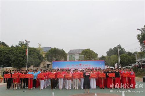 冬日早上7點鐘,太陽還剛剛爬上東山,來自全鎮(zhèn)20個文藝演出隊伍,演員身著統(tǒng)一的服裝,興致勃勃地云集在去年由當(dāng)?shù)剜l(xiāng)賢凌云劍義投百萬興建的呈臺“幸福屋場”。隨后,她們高舉紅旗和隊牌,一個接一個臉帶笑容,浩浩蕩蕩地繞場一圈,舉行了盛大的入場式:列方陣、奏國歌、領(lǐng)導(dǎo)致開幕詞。