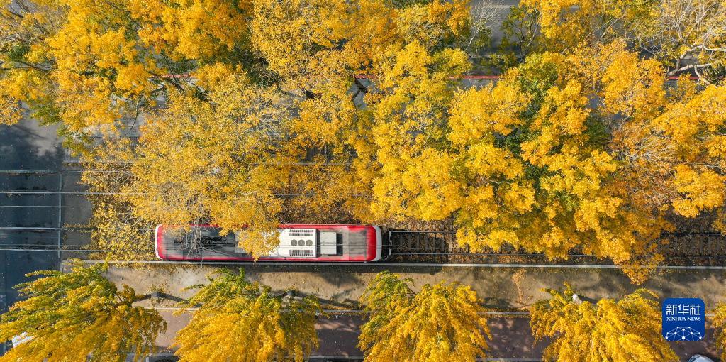 10月24日,一輛電車行駛在長春市春城大街(無人機(jī)照片)。