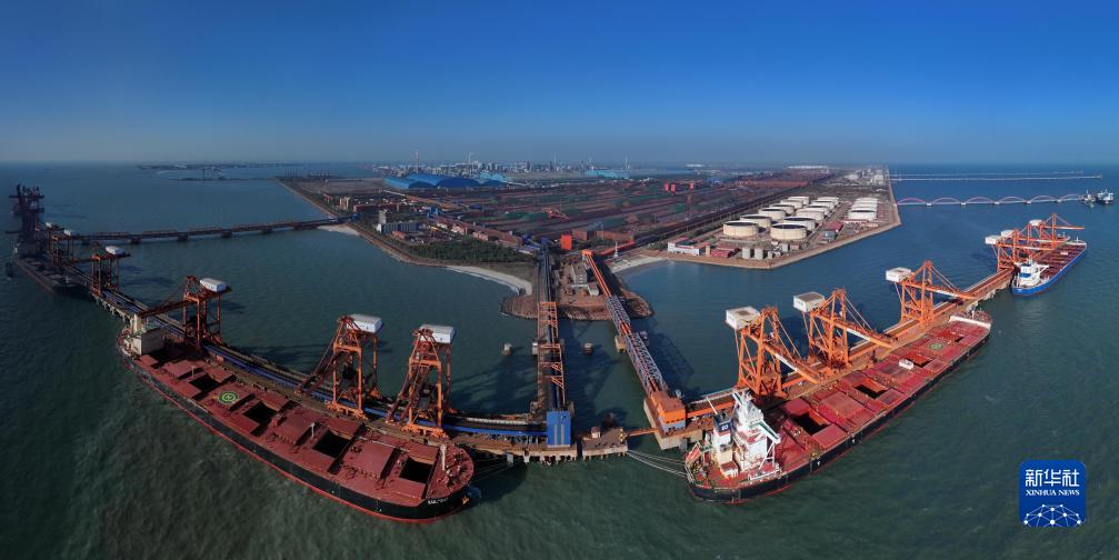 10月27日,多艘輪船靠泊在唐山港曹妃甸港區(qū)礦石碼頭卸載(無(wú)人機(jī)全景照片)。
